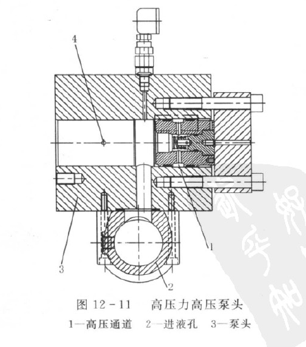 在工作壓力高于100MPa時,此時同種機型流量相對較小,優先考慮交變應力造成的疲勞破壞作用,進、排液閥一般采用中心閥組的結構形式,液體介質經柱塞抽吸通過中心閥組外側一組互不相交的孔道進入高壓缸內,通過柱塞壓縮后,環形的進液閥板關閉進液孔,高壓水由中心孔道經排液閥排到泵頭,由此可見,高壓泵頭的作用僅相當于一個高壓通道,在高壓泵工作期間并不產生交變應力,因此可能有很長的工作壽命。