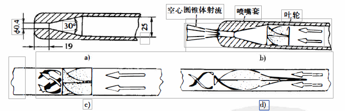 錐形水射流鉆孔的噴嘴是在對普通噴嘴添加了一個葉輪改進后得到的,由葉輪進口段、錐形收縮段及直線出門段三段組成,后兩段依據經典理論選取參數。 為使該噴嘴在土層內連續鉆孔時鉆孔的孔徑為噴嘴直徑的3~6倍,噴嘴前面要連接一根進水管,且管 中水的流速應比噴嘴出口處水的流速小一個數量級。 使用時,進水管 的水通過葉輪變成在管道內繞管道軸線旋轉的水流,該水流進入錐形收縮段后被加速至390m/s,隨后進入長度為2~3倍噴嘴直徑的直線 段部分,在出口處流體由于仍然保持旋轉狀態從而產生一個能往前延伸的空心圓錐體射流18)。空心圓錐體射流的能量集中在圓錐體外層的周邊,當噴嘴進入土 層后,被圈在空心圓錐體內的部分就能被除去。 試驗表明,當流體壓力很低時(小于O. 7MPa),水在空心錐周邊上的沖擊力也足以穿透土體。 當水流壓力處千工作壓力時,空心錐體變成不連續的液滴,此時射流與材料的作用機理土要為液滴的沖擊作用。 射流作用于材料表面的滯止壓力隨靶距、噴嘴直徑的增加呈指數形式衰減,但鉆孔直徑與靶距基本上呈線性關系。 描桿是地下采礦的常用支護設備,采用高壓水射流鉆描桿孔, 鉆桿不需承受很商的推力和扭矩,鈾桿孔的直徑就能減小到 25. 4mm或更小( 一般的機械鉆進達不到此目標,鉆出的孔徑都較大),樹脂描桿直徑就可減小。 基于此,就有了水射流鈾桿孔鉆機該鉆機主要由高壓水發生系統、鉆桿、鉆頭和機架等部件組成。高壓水發生系統可提供流量1. 9L/m血壓力280MPa的高壓 水流,功率22kW。 鉆頭體山工具鋼制成,其上裝有碳化鎢合金刀片和三個噴嘴,并開有沖洗液輸出口。 噴嘴錐角13°,直徑 o. 203~0. 229mm,直線段長度為2~3倍噴嘴直徑。采用與旋轉軸線成 15°角的羊只噴嘴,在抗壓強度為 147MPa的砂巖中,每分鐘可鉆進 3m;但若鉆進耐磨蝕的巖石或控制鉆孔尺寸,噴嘴數噩就需增加為三個。 鉆孔的孔壁較粗糙,這對樹脂與巖石的緊密結合有利,但鉆孔尺寸必須控制,鉆頭體上的合金刀片就是用來保證孔尺寸保持在一定范圍內的。 該鉆機鉆桿由兩根同心金屬管組成。 內管壁厚,用于輸送高壓水并傳遞鉆孔所需的推力和扭矩;外管壁薄并固定,主要用來輸送沖洗巖屑用的低壓沖洗液,保護旋轉的內 管不致磨損,并能提供附加的抗彎剛度和起到導向作用。 試驗表明,使 用該鉆機時鈾桿支護時間約為3min,而普通鉆機 鉆孔時為5min。
