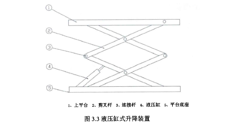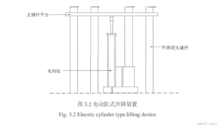 根據(jù)待清洗臂架結構、清洗裝置的工作環(huán)境以及超高壓水射流的清洗特點,對清洗裝置升降平臺機構進行結構性設計。針對清洗裝置的支撐平臺升降功能的實現(xiàn),提出兩種方案,第一種方案如圖3.2所示。清洗裝置在豎直方向上的運動是通過同步帶式電動缸的伸縮來實現(xiàn)。支撐平臺通過四個套筒固定在水平面上,電動伸縮桿推動支撐平臺做上下調(diào)節(jié),從而實現(xiàn)升降功能。此方案不但能保證工作的效率還使得控制非常精確。第二種方案如圖3.3所示。升降裝置采用剪叉式結構,滾輪經(jīng)過凸輪驅動升降平臺做勻速升降運動,通過操作手柄對液壓缸壓力的控制實現(xiàn)升降平臺清洗裝置高度的調(diào)整,使清洗盤與待清洗表面達到同一水平面。因大型工程機械設備一般有多種樣式和型號,臂架安裝固定在臂架夾持機構上最高可達700mm,電動缸式方案雖然調(diào)節(jié)速度較快且較為精準,但電動缸由于自身高度過高,安裝不便且運行的平穩(wěn)性與承載能力都不如剪叉式液壓升降平臺,對比分析上述兩種方案,液壓缸式方案更加適合。