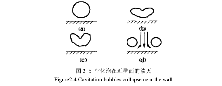 (2)空化泡在近壁面附近的破裂 如圖,當球形空化泡運動到壁面附近時,空化泡與壁面之間存在液流的橫向流動,使空泡在靠近壁面的一端所受到的液壓低于較遠的一端,因此遠端壁面向內凹進,直到近壁被穿透,此時原來的空泡分裂成兩個氣泡,在兩個泡之間就形成了速度很高的微射流。這種破裂形式產生的高速微射流方向是指向壁面的,因此其沖蝕力很強。 這種形式的破滅所產生的微射流即是認為的超空泡高壓水射流清洗的機理之一