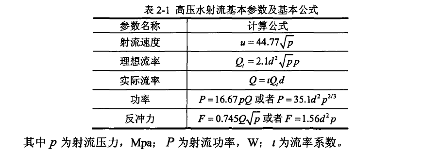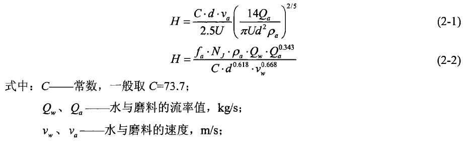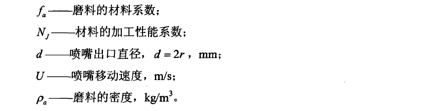 從以上兩個模型中可以看出,相對于Hashish的切割模型,Zeng和Kim的經驗模型中考慮了切割材料的因素,二者共同指出了出口直徑、核心區的磨粒速度以及磨粒流率對切割深度的影響。總結可知,入口壓力、噴嘴自身結構參數、磨料與水的流率等是保證切割質量的主要參數。表2-1為本文總結的部分基本參數的對應的計算公式。