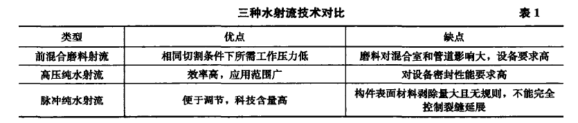 高壓水射流技術從工作介質上主要分前混合磨料射流、高壓純水射流和脈沖純水射流三種,各有優缺點,具體對比見表1,一般不采用純水,而是混合一些石英砂增強硬度(可增強到100多倍)。