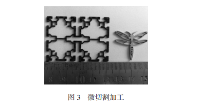 微切割是在水切割工藝基礎(chǔ)上的又一派生,它專門針對薄板材料、復(fù)合材料和稀貴金屬材料的精細加工,強調(diào)切縫趨于零(即切割后的組合尺寸與切割前無大變化)和超高精度加工,尤其對銳角、窄邊和復(fù)雜圖案的切割。微切割的工作量不大,也沒有切割速度要求,但要想很好的完成微切割加工,針對不同材料有以下 2 種工藝路線:(1)精細磨料射流,即在高端超高壓射流基礎(chǔ)上,采用 150 目以上的精細磨料,射流噴嘴和流量都將進一步降低;(2)純水射流,即在 450 MPa 甚至更高的超高壓射流基礎(chǔ)上,采用純水射流以 3 倍以上超音速射流作業(yè)。微切割的精度目標:磨料射流復(fù)現(xiàn)性精度±0.01 mm;純水射流線性精度 ±0.067 mm/min,切割速度 10000 mm/min。圖 3 所示為微切割加工實例。
