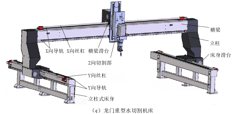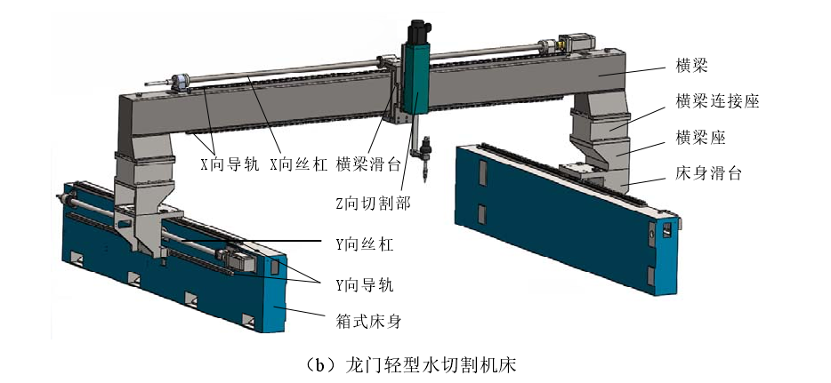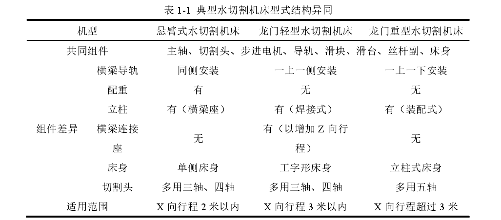 這三種基本型式有其對應的選擇標準,如切割對象大小、行程長短、精度等級、價位等都是決定型式選擇的要素。水切割機床的主要部件基本相同,均是由橫梁、主軸、切割頭、步進電機、導軌、滑塊、滑臺、絲桿副、立柱、床身等組成,只是一些部件的結構不同,立柱在龍門式水切割機床中使用,而且結構及裝配形式也不相同:龍門輕型是將立柱焊接在橫梁下方當作一個部件;龍門重型則將立柱作為單獨組件,通過螺釘螺母裝配在橫梁兩端;懸臂式中的橫梁座,起到支撐橫梁在床身上滑動的作用,可將其看作立柱。由于懸臂式水切割機床的懸臂結構,為防止變形過大,需要在懸臂梁固定端加上配重。導軌的安裝方式、床身的結構也各不相同,但均是通過地腳螺栓固定在地面上,詳細異同點見表1-1。水切割機床的坐標系沿橫梁上絲桿方向為X向,沿床身上絲桿方向為Y向,豎直方向為Z向。